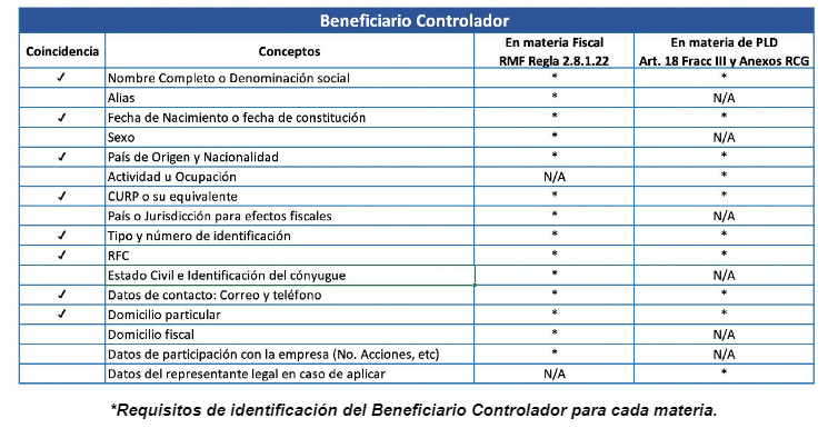 Adicional a lo anterior, si buscamos los beneficios para México podríamos destacar que con la identificación del beneficiario controlador en materia fiscal se tendrá identificado en las empresas a la persona física o grupos de personas físicas que son propietaria de la entidad, mientras que en materia de PLD se identificará a la persona física que controla u obtiene el beneficio de la contraprestación contratada, que a su vez servirá para ir entrelazando la información que se tiene con las actividades vulnerables, empresas y la propia autoridad, ya que en ambas situaciones las empresas y actividades vulnerables no podrán no contar con la información de los Beneficiarios Controladores, lo cual impacta positivamente para el país, dado que si comparamos la información que la autoridad nos pide identificar tanto en materia fiscal como en PLD, podemos ver que hay conceptos iguales como se muestra a continuación: