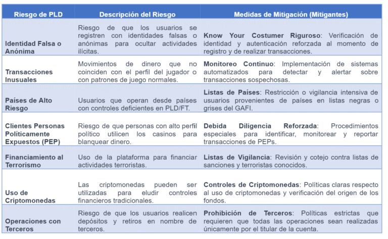 La importancia de estas obligaciones radica en su capacidad para preservar la seguridad de la industria del juego en línea y protegerla contra su utilización como vehículo para el lavado de dinero. A continuación, se muestra una pequeña matriz de posibles riesgos asociados en PLD, así como el posible mitigante con la intención de desglosar cómo los casinos en línea pueden y deben cumplir con sus responsabilidades en materia de PLD.